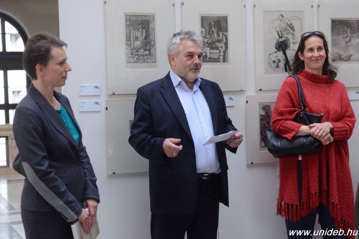 – A 20. század grafikai alkotásainak legjavát a könyvtárak birtokolják, a Debreceni Egyetem is hatalmas anyaggal rendelkezik, amelynek töredéke a most kiállított néhány alkotás. 501 évvel ezelőtt született az első rézkarc Németországban, Urs Graf alkotása. Ebből az alkalomból a Grafikusművészek Ajtósi Dürer Egyesülete Debrecen hat különböző helyszínen mutatja be az elmúlt öt évszázadban született remekművek egy részét. Nem véletlen, hogy a kiállítás-sorozat nyitóünnepségét Szent Lukács, a festők védőszentje napján tartották meg a Kölcsey Központban – fogalmazott Tamus István.