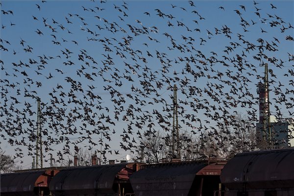Galambraj repül a debreceni vasútállomás közelében 2016. január 13-án. A világ egyik legrangosabb biológiai folyóirata, a Current Biology 2015 végén számolt be címlapon Bíró Dóra (Oxfordi Egyetem) és Vicsek Tamás (ELTE) együttműködő kutatócsoportjának felfedezéséről, miszerint a rajban repülő galambok közül a vezetők nemcsak a leggyorsabbak, hanem a legjobb navigációs képességekkel is rendelkeznek. A négyfős kutatógárda a postagalambok hazatalálását vizsgálta. MTI Fotó: Czeglédi Zsolt
