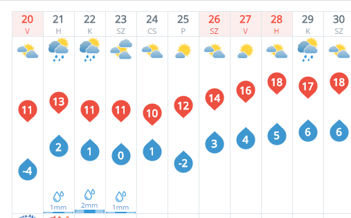 Hétfőn hajnalban az ország nagyobb részén gyengén felhős időre lehet számítani, de elsősorban a Zempléni-hegység környékén, a Tiszántúlon és az Őrség tágabb környezetében megnövekszik a felhőzet, és errefelé egy-egy zápor is kialakulhat. Napközben a főváros környékén és az Alföld középső részén valószínű a legtöbb napsütés. A Dél-Dunántúlon, valamint a Nyírségben és Borsodban felhősebb lehet az ég, de számottevő csapadék ezeken a területeken sem valószínű. A legalacsonyabb hőmérséklet általában mínusz 3 és plusz 5 fok között, a legmagasabb hőmérséklet 11-16 fok között alakul.