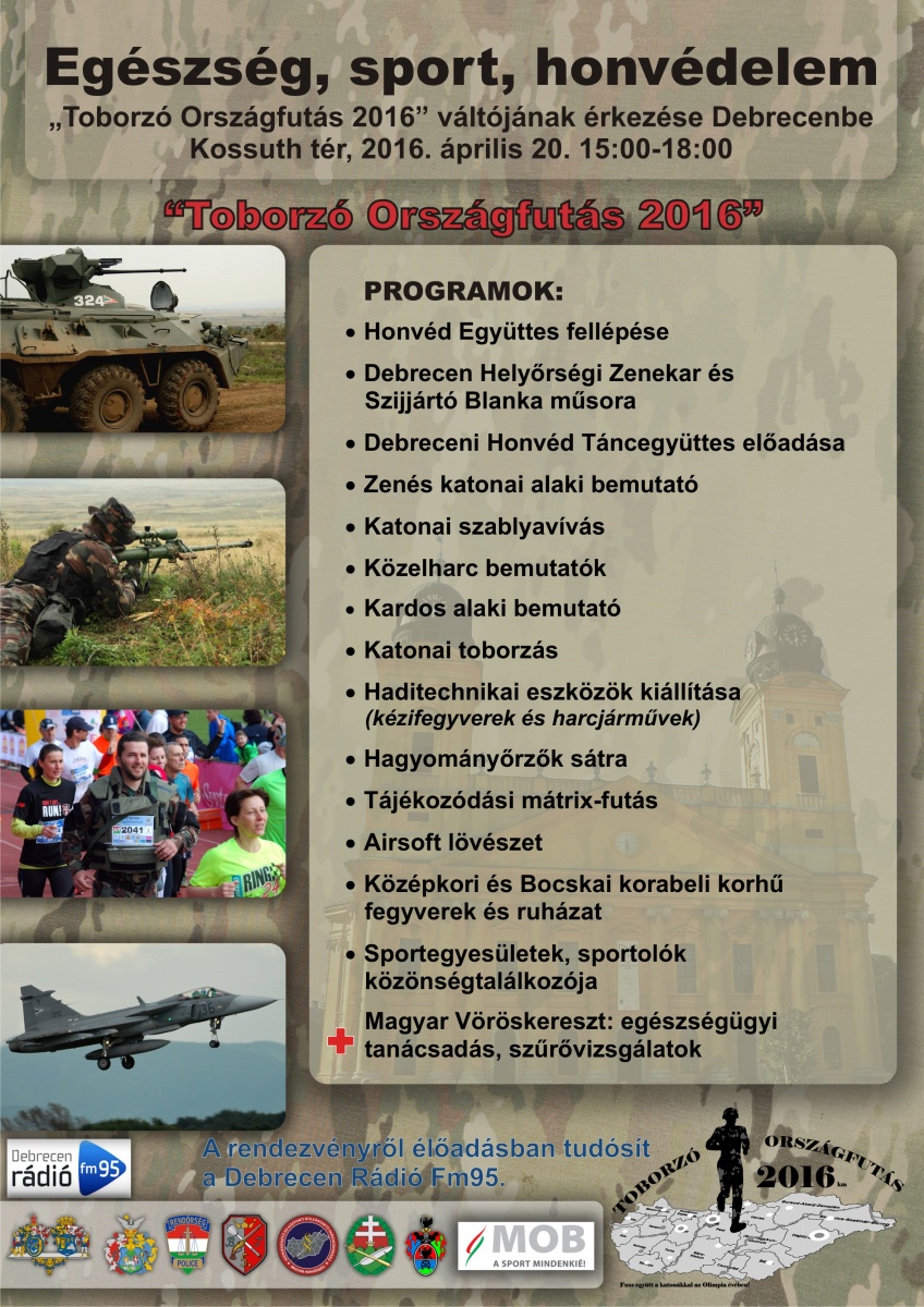 A Hajdú-Bihar Megyei Rendőr-főkapitányság értesíti a járművezetőket, hogy 2016. április 20-án 14 órától előreláthatólag 15 óra 30 percig, valamint 2016. április 21-én 7 órától előreláthatólag 9 óráig a Magyar Honvédség szervezésében „Toborzó Országfutás 2016” elnevezésű rendezvény miatt az alábbi forgalmirend-változás lép életbe Debrecenben: