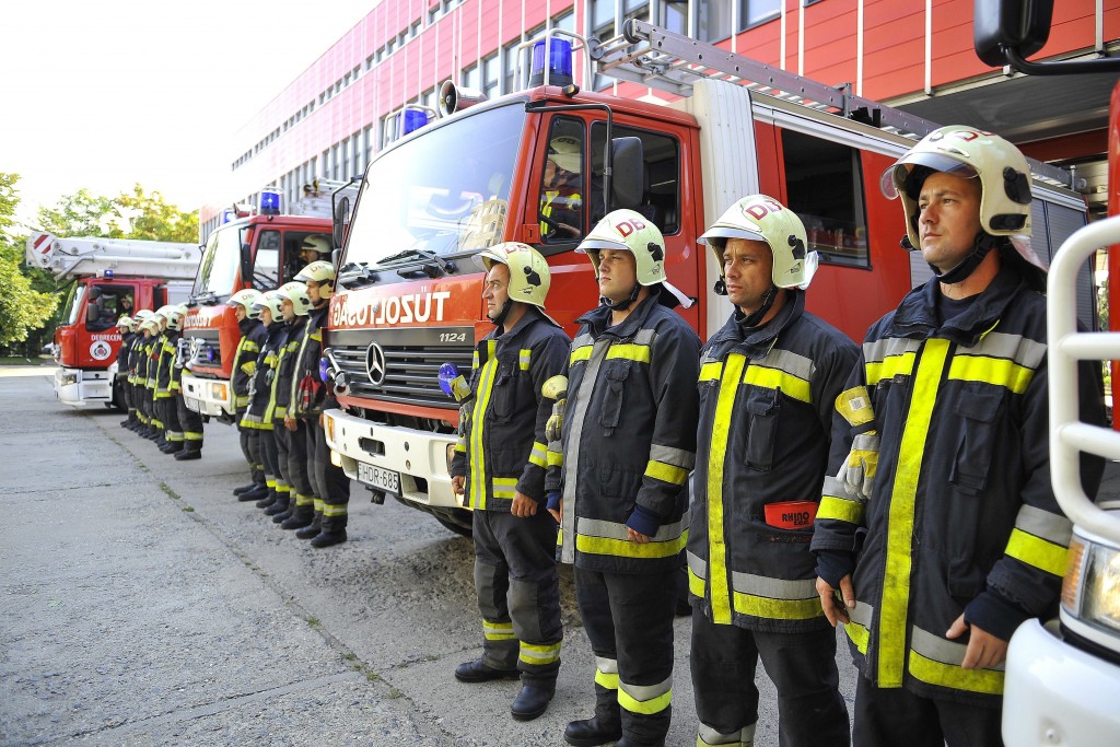 Tűzoltók tisztelegtek szirénázó szerkocsik előtt a 2001. szeptember 11-i New York-i terrortámadások 15. évfordulóján tartott megemlékezésen a Hajdú-Bihar Megyei Katasztrófavédelmi Igazgatóság épülete előtt Debrecenben 2016. szeptember 11-én.