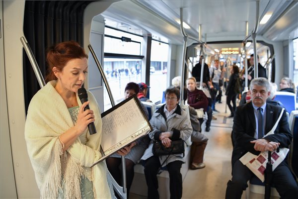 Vékony Anna és Papp István, a debreceni Csokonai Nemzeti Színház színészei Arany János-verset olvastak fel a költészet napja alkalmából az 1-es villamoson, Debrecenben 2017. április 11-én. MTI Fotó: Czeglédi Zsolt.gffdhhjj