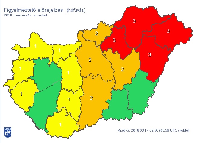 Az Országos Meteorológiai Szolgálat által szombat délelőtt az MTI-hez eljuttatott veszélyjelzés szerint Borsod-Abaúj-Zemplén, Hajdú-Bihar, Heves és Szabolcs-Szatmár-Bereg megyében van érvényben a legmagasabb fokú (piros) figyelmeztetés a hófúvás miatt.