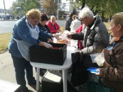 A villámcsődület utáni ételosztáson ebben az évben talán a legtöbben vettek részt. Közöttük utcán élők, kisnyugdíjasok, egykor szebb napokat látott honfitársaink. Szomorúan láttuk, hogy nagyon sokan jöttek kisgyermekkel, rokkant kocsival. A már ismert arcok mellett sok ismeretlen is volt, Debrecen külső városrészéből, Pacról is érkeztek felebarátaink. A több mint 150 vendéget töltött káposztával, friss kenyérrel és egy szelet tortával vártuk.