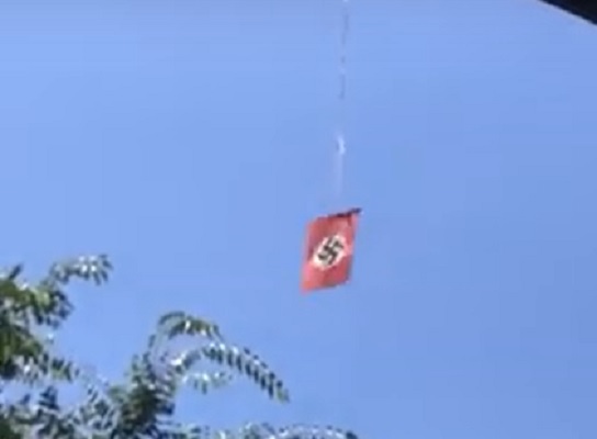 Lebegő horogkeresztes zászlót fedezett fel a 444.hu olvasója a Nyugati pályaudvar bejáratánál.Vajon mi lehetett ez, filmforgatás, vagy náci gyermeknap?