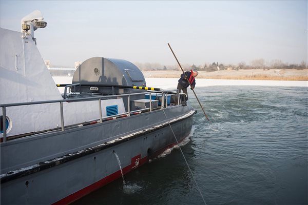 Erdős László gépkezelő csáklyával leveri a jeget Tiszalöki Vízlépcső felvizén állomásozó Jégvirág IX. jégtörő hajó oldaláról 2017. január 10-én. Az Észak-magyarországi Vízügyi Igazgatóság hajósai 24 órás szolgálatban állnak készenlétben a Tisza menti műtárgyak védelmére. Addig csak az állomáshelyük jégtelenítésére indítják be a motorokat, hőmérséklettől függően 2-5 óránként. MTI Fotó: Balázs Attila