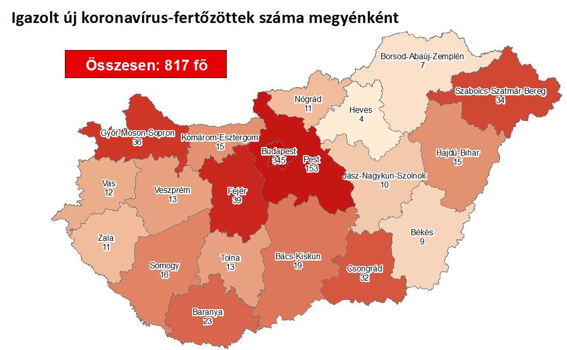 Az oldal térképe alapján továbbra is Budapesten (345 ember) és Pest megyében (153) van a legtöbb fertőzött.