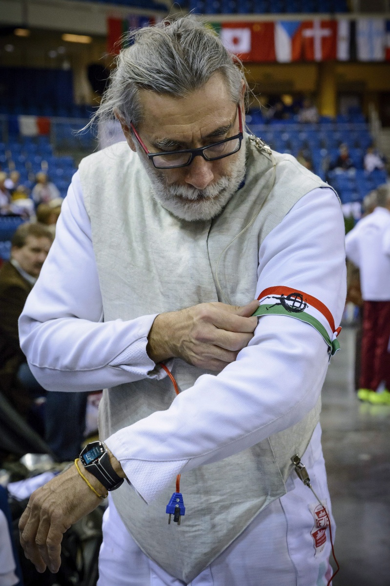 Pap Jenő korábbi világbajnok vívó igazítja meg karján lyukas nemzetiszínű karszalagját a veterán vívó-világbajnokságon a debreceni Főnix Csarnokban 2014. október 23-án. Az október 26-ig tartó versenyen negyvenhárom nemzet 553 sportolója lép pástra három korosztályban. A magyar csapat tagjai ezen a napon a karjukon viselt karszalaggal emlékeznek meg az 1956-os forradalomról és szabadságharcról. MTI Fotó: Czeglédi Zsolt