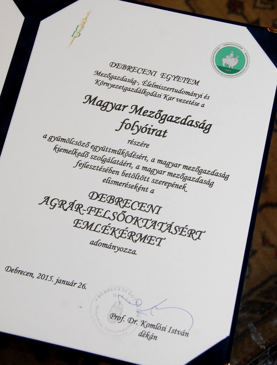 A Debreceni Egyetem Mezőgazdaság-, Élelmiszertudományi és Környezetgazdálkodási Karának vezetősége a Debreceni agrár-felsőoktatásért emlékérmét adományozta az idén hetven éves szakmai lapnak.