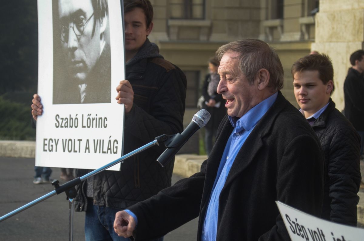 Ötszáz debreceni általános és középiskolás diák szavalta együtt Szabó Lőrinc két versét péntek délután a Debreceni Egyetem Főépülete előtt.