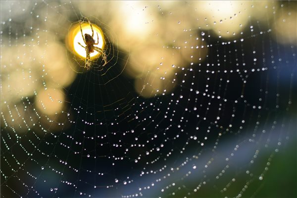 Harmatcseppek kora reggel egy pókhálón Debrecen közelében 2015. szeptember 2-án. MTI Fotó: Czeglédi Zsolt