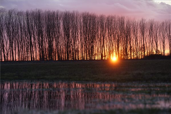 Naplemente a Hajdú-Bihar megyei Hosszúpályi határában, előtérben belvízzel elöntött mezőgazdasági terület 2016. február 11-én. MTI Fotó: Balogh Zoltán