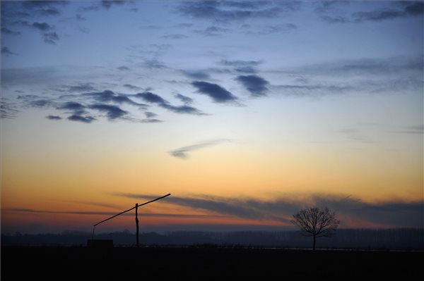 Gémeskút és napfelkelte Balmazújváros közelében.