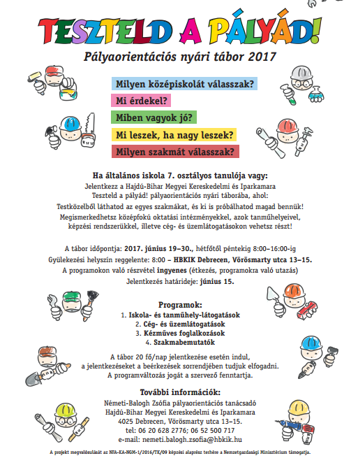 A Teszteld a pályád! pályaorientációs nyári táboron való részvétel a gyerekek számára ingyenes, a kamara utazást és meleg ebédet is biztosít. Az egyes napokon a férőhelyek száma 20-30 főre korlátozott, egy tanuló azonban több programnapon részt vehet. A helyek feltöltése érkezési sorrendben történik, a szabad kapacitás függvényében csoportok jelentkezését is szívesen várjuk.
