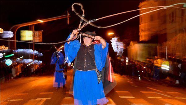 Hagyományőrzők csergettek és tülköltek a Hajdúszoboszlón rendezett óévbúcsúztató csergetésen 2018. december 31-én. A szilveszteri csergetés több évszázados hagyományon alapuló rendezvény. 1559. december 31-én kolompszóval és ostorpattogtatással ijesztették el a helyiek a “Szoboszlót” fenyegető török hadsereget.