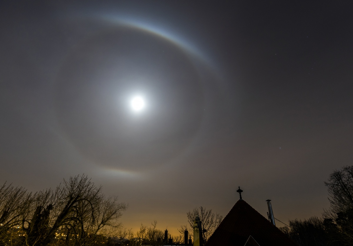 Halojelenség látszott a Hold körül Budapesten, a II. kerületből fotózva 2019. január 21-én.