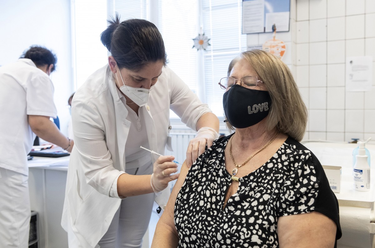 Pálfy Tímea baleseti sebész beolt egy nőt az orosz Szputnyik V koronavírus elleni vakcina első adagjával a Jósa András Oktatókórház oltópontján Nyíregyházán 2021. március 15-én.