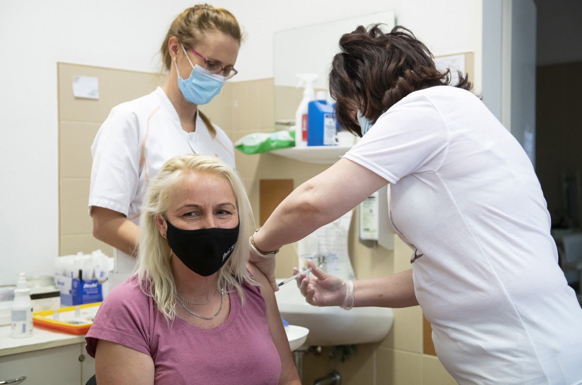 Bélteczki Zsuzsanna pszichiáter főorvos beolt egy iskolai konyhai dolgozót a német-amerikai fejlesztésű Pfizer-BioNTech koronavírus elleni oltóanyag, a Comirnaty-vakcina második adagjával a Szabolcs-Szatmár-Bereg Megyei Kórházak és Egyetemi Oktatókórház Sántha Kálmán Szakkórházában kialakított oltóponton Nagykállóban 2021. május 16-án.