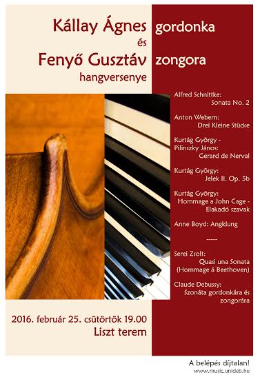 Fenyő Gusztáv Skóciában élő zongoraművész és Kállay Ágnes gordonkaművész, a Liszt Ferenc Zeneművészeti Egyetem tanára ad kamarahangversenyt, amelyet február 25-én, csütörtökön rendeznek a Zeneművészeti Kar Liszt termében.A hangversenyre a belépés díjtalan.