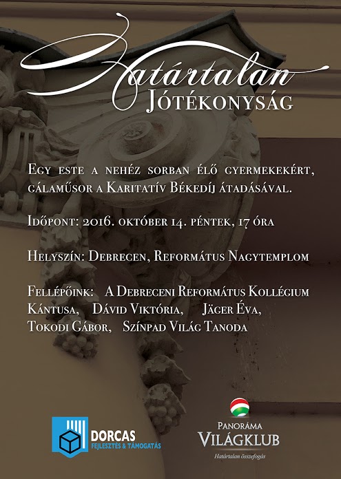 2016. október 14-én (pénteken) 17 órától rendezik a Dorcas Aid Alapítvány és a Hajdú-Bihar Megyei Panoráma Világklub szervezésében a Határtalan Jótékonyság című gálaműsort a Debreceni Református Nagytemplomban. A rendezvényen köszöntőt mond Komolay Szabolcs, Debrecen város alpolgármestere, majd átadják a nemzetközi Karitatív Békedíjat.