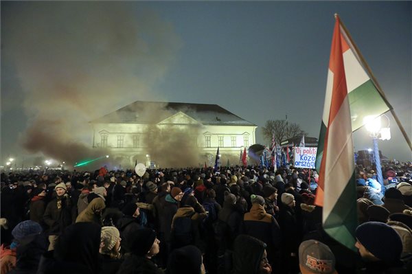 A kormány és a köztársasági elnök ellen tüntettek ellenzéki pártok, civil szervezetek és szakszervezetek pénteken Budapesten, a Sándor-palota előtt azt követően, hogy Áder János aláírta az önkéntes túlmunkaidő bővítéséről és a közigazgatási bíróságok felállításáról szóló törvényeket. A Budapesti Rendőr-főkapitányság (BRFK) szombat hajnalban közölte, előállítottak egy demonstrálót, aki füstgránátot dobott az államfői hivatalnak helyt adó épületre.