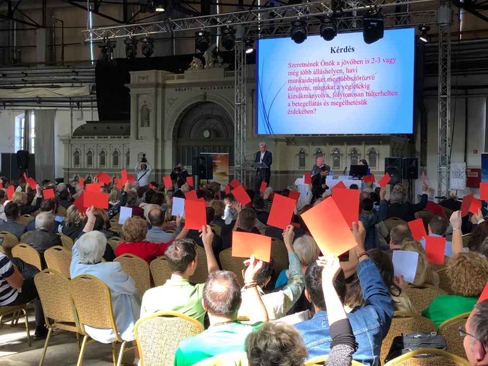 Szalay-Bobrovniczky Vince az Orbán-kormányok döntéseit citálva emlegette fel a béremelést. A jelen lévő orvosok túlnyomó többsége lengette a piros lapot.