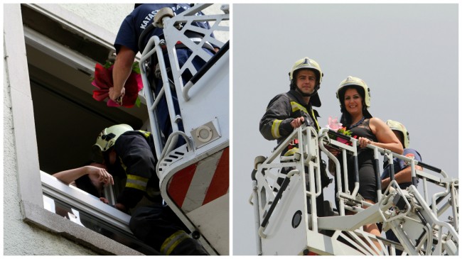 Dajka Gábor tűzoltó őrmester a magasban kérte meg párja, Vitai Gabriella kezét Nyíregyházán.