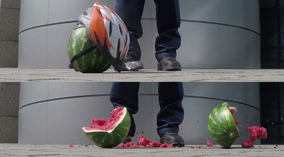 A rendőrség figyelemfelkeltő videója összesen 20 másodperc, ám szó szerint csattanósra sikeredett: láthatjuk rajta, mi történik a bukósisakban, illetve anélkül földhöz csapott dinnyével.