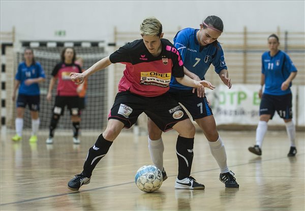 A hajdúböszörményi Vágó Fanny (j) és Gál Tímea, az Astra HFC játékosa a futsal Magyar Kupa női döntőjében vívott Hajdúböszörményi TE – Astra HFC találkozón Kiskunfélegyházán 2015. március 1-jén. A női tornát az Astra HFC csapata nyerte. MTI Fotó: Ujvári Sándor