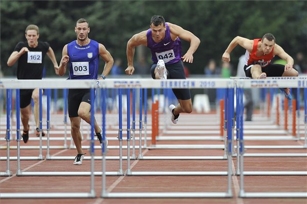 A későbbi győztes Baji Balázs (k) az Atlétikai Magyar Szuper Liga döntőjének 110 méteres gátfutás számában a debreceni Gyulai István Atlétikai Stadionban 2015. szeptember 5-én. MTI Fotó: Czeglédi Zsolt