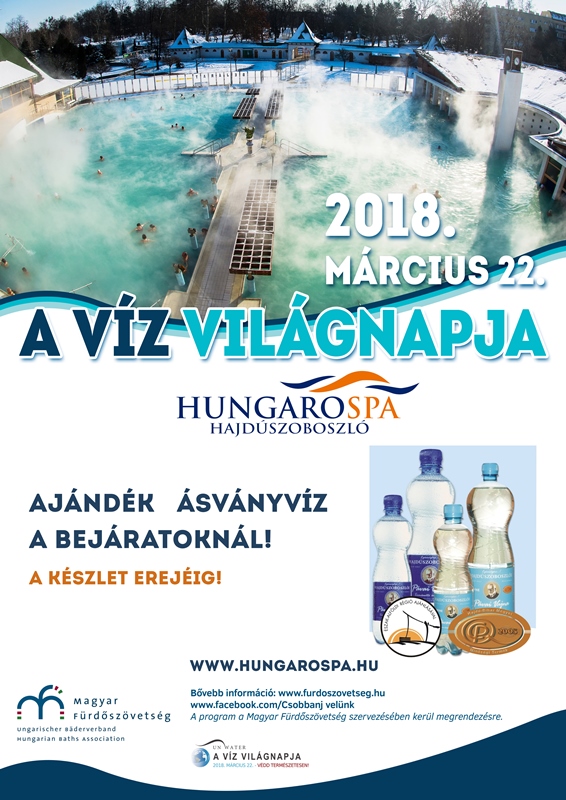 2018. március 22-én ünnepeljük a Víz Világnapját. A Hungarospa Hajdúszoboszlói Zrt. is csatlakozott az eseményhez. Ezen a napon ajándék ásványvízzel várják a Gyógyfürdő, az Aqua-Palace Élményfürdő és az Árpád uszoda vendégeit.